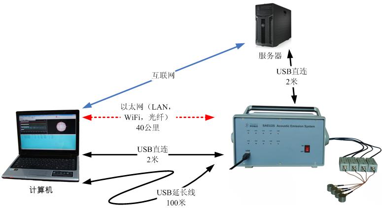 ● 聲發(fā)射檢測儀主機與電腦的通訊可以采用標準高速USB接口直接連接,也可以采用100米長的延長USB接口,更可以使用WiFi,五類線、光纖等以太網(wǎng)連接,選用接入互聯(lián)網(wǎng)的方式可實現(xiàn)聲發(fā)射檢測儀主機與電腦的遠程連接