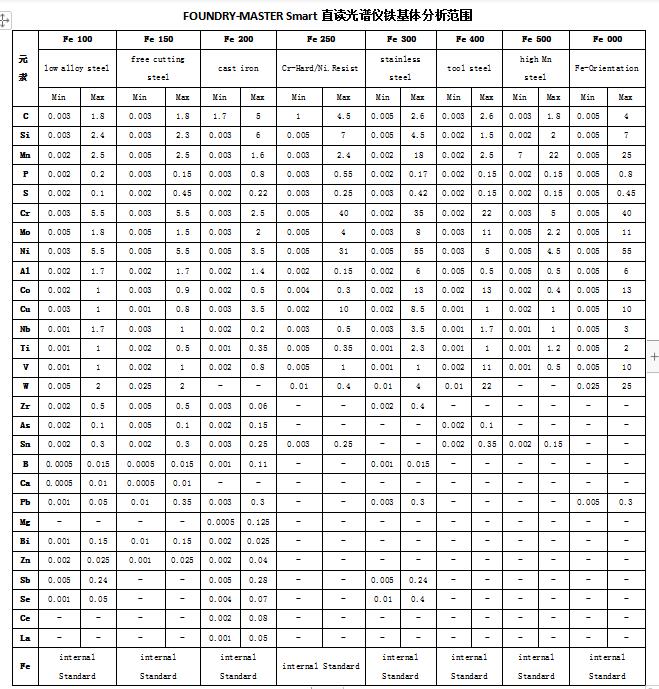 儀器適用于鐵金屬樣品的精確定量成分分析、牌號鑒別、材料分選。根據(jù)客戶的具體要求,本銷售協(xié)議所對應(yīng)的儀器的分析范圍為鐵基體;鐵基體可分析元素種類:碳C、硅Si、錳Mn、硫S、磷P、鉻Cr、鎳Ni、鉬Mo、釩V、鈦Ti、鎢W、鈷Co、銅Cu、鋁Al、錫Sn、硼B(yǎng)、鈮Nb、鎂Mg、鉛Pb、鋯Zr等元素。